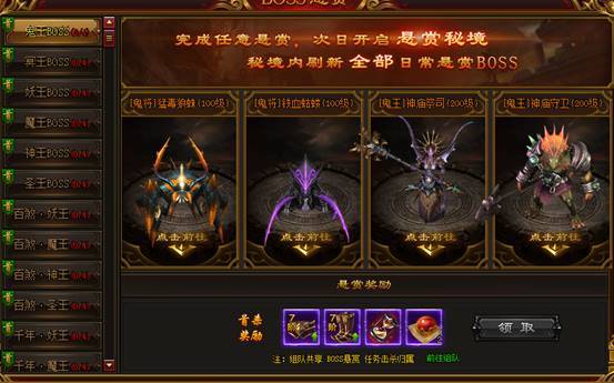 玩法简介:1.分为普通悬赏和领击悬赏,击败指定BOSS可获得丰厚悬赏奖励