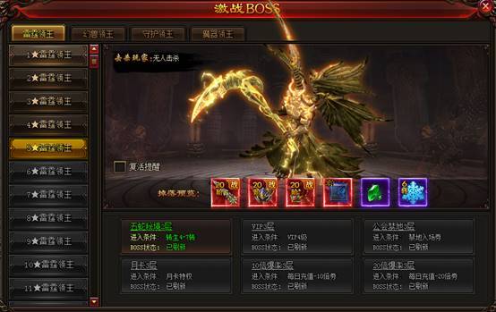 2.领主BOSS:包括雷霆领主、幻兽领主、守护领主、魔器领主,击杀后可获得大量红装、幻兽蛋、守护装备和珍稀魔器等。