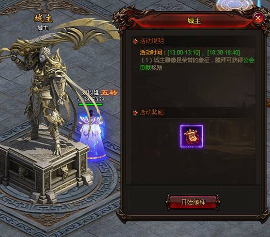 玩法简介:1.活动期间在主城膜拜城主雕像,每10秒即可获得一次公会贡献奖励