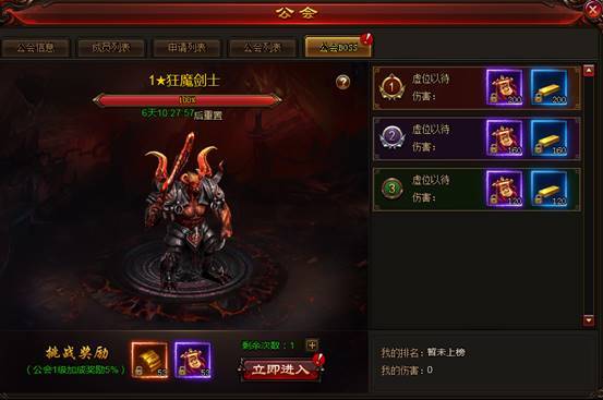 玩法简介:1.玩家在30秒内对公会BOSS尽量造成更多的伤害,每次挑战均可获得奖励。