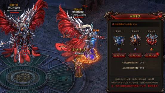 玩法简介:1.玩家可使用深渊召唤令在公会深渊地图召唤对应的深渊BOSS,BOSS等级越高击败奖励越丰厚。
